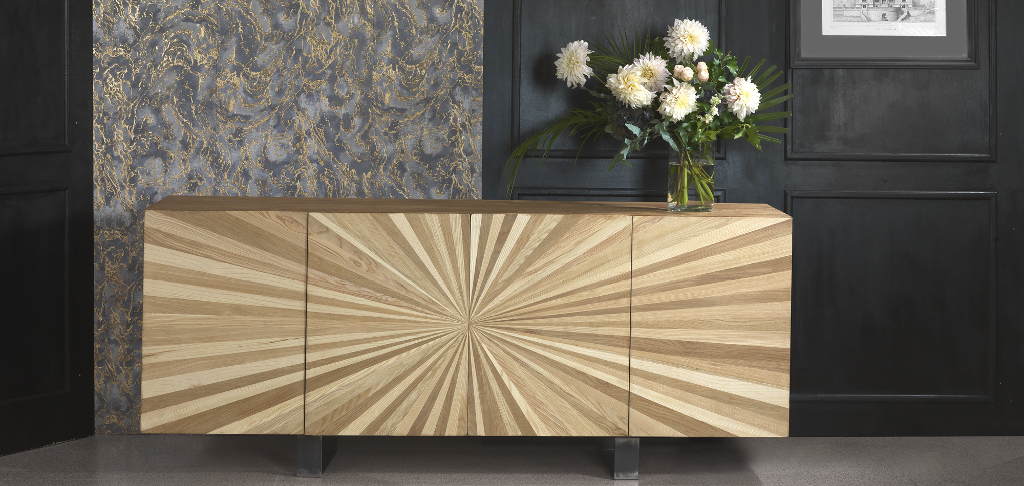 “Beam bundle” design 4-door sideboard with iron feet and 2 shelves inside.